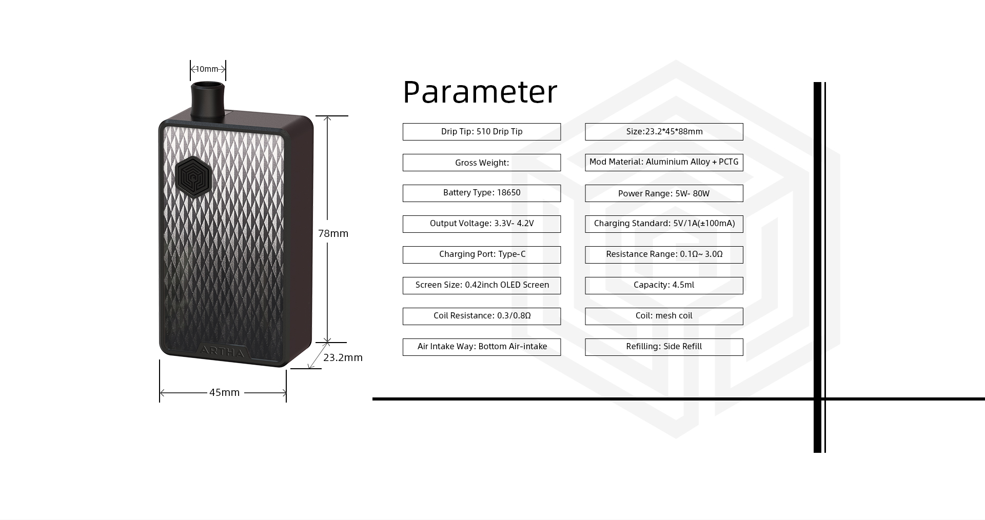 Artha Pod Mod is a brand new AIO device of Advken. Different from previous AIO devices, this new Artha Pod Mod is equipped with many amazing and uncomplicated features. With a maximum 4.5ml capacity and 80w maximum output, this tiny pod mod gives a geat lasting and powerful vape. Innovative and scientific airflow design deliver the natural flavor and make a effortless vaping. Let’s see more details as following. Welcome to the VAPOR WORLD of ARTHA POD MOD.